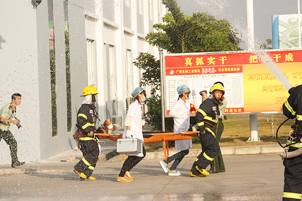 下午16:00點整,一聲急促的警報拉開了此次演練活動的帷幕。“火情”從辦公大樓三層某辦公室起火,火勢燃燒猛烈并迅速向四周蔓延,情況危急。中國電子北海產(chǎn)業(yè)園立即啟動《滅火應(yīng)急疏散預(yù)案》,滅火救援行動組、現(xiàn)場警戒組、技術(shù)保障組、疏散引導(dǎo)組、通訊聯(lián)絡(luò)組、醫(yī)療救護(hù)組立即投入各自崗位,組織疏散樓內(nèi)人員,利用室內(nèi)消火栓進(jìn)行滅火,并隨即撥打119報警。員工紛紛拿起了自備的濕毛巾,捂著口鼻,沿著廠房疏散通道迅速有序的離開“火災(zāi)現(xiàn)場”到達(dá)安全地帶。5分鐘后,北海市消防支隊特勤中隊消防官兵到達(dá)現(xiàn)場,經(jīng)偵查,發(fā)現(xiàn)火勢起火點在三樓的展廳并且燃燒猛烈,大量煙霧竄至樓外,有人員被困樓頂。指揮員立即匯報并下達(dá)搜救命令。搜救小組由大樓正門進(jìn)入,從三樓至一樓進(jìn)行搜救,利用擔(dān)架將受傷員工轉(zhuǎn)移到救護(hù)車上。救援小組利用云梯車將被困樓頂?shù)膯T工成功營救到地面。在消防隊員的強(qiáng)攻下,火勢及時得到控制。整個演練過程指揮得當(dāng)、操作規(guī)范、緊張有序。